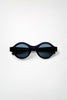 The 'Rei' sunglasses from the OM.7 collection. Handmade with bio-acetate, featuring a distinct round silhouette, bold construction with dimensional contours, and tapered temples.